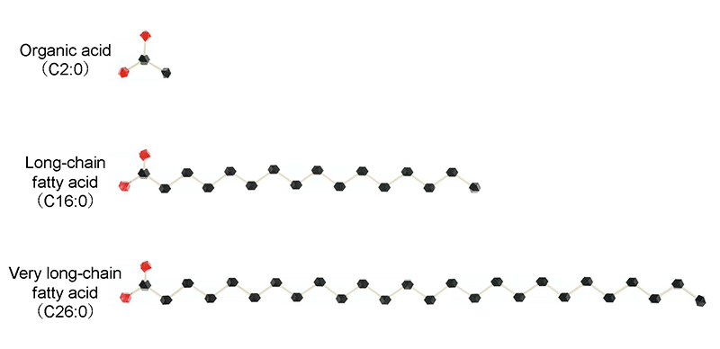 Fatty acids are basic components of fats and are made up of chains of carbon atoms. In the body, they are used as an energy source and also play important roles as building blocks of cell membranes and as starting materials for various biologically active substances. Fatty acids are grouped by the length of their carbon chains into short-, medium-, long-, and very long-chain fatty acids. The very long-chain fatty acid studied here has a chain of 26 carbon atoms.