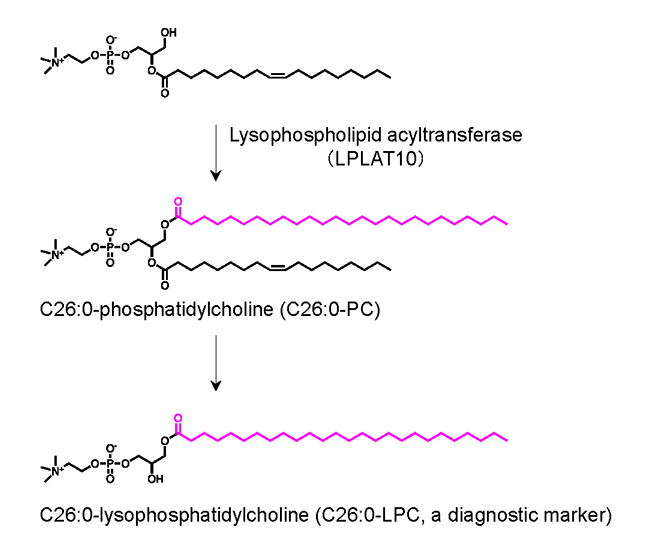 This study found that C26:0-PC is first made in cells through a specific enzyme (LPLAT10). This substance is then further processed step by step inside the cell to produce C26:0-LPC, which is used as a marker to help diagnose the disease.