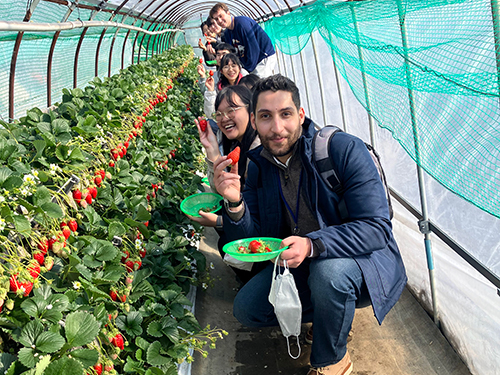 In the morning, students visited Nihondaira and Kunozan Toshogu Shrine, learning about the area's unique terrain and historical background. They then toured the stone-walled strawberry farms in the Kuno district, studying traditional cultivation methods adapted to the hillside landscape and warm climate.